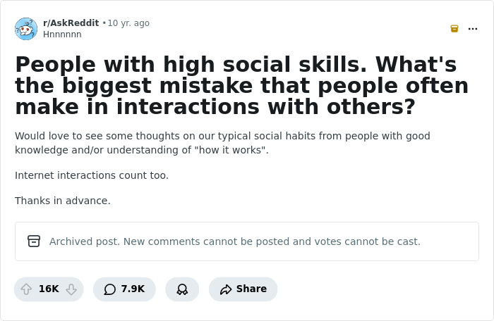 To figure out how, Redditor Hnnnnnn asked platform users who consider themselves experts in people skills to share the most common errors they notice.