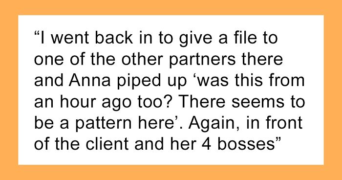 A day later, a staff meeting was called to discuss professionalism in the office. Turns out, the client who witnessed Anna’s emotional outburst had approached the founder of the company, as it really upset her seeing Anna treat her colleagues in such a disturbing way. Judy made sure to let the employees understand that their clients had already seen enough, and that yelling was totally unacceptable. Later on, Anna, very hesitantly apologized but the author just shrugged it off.