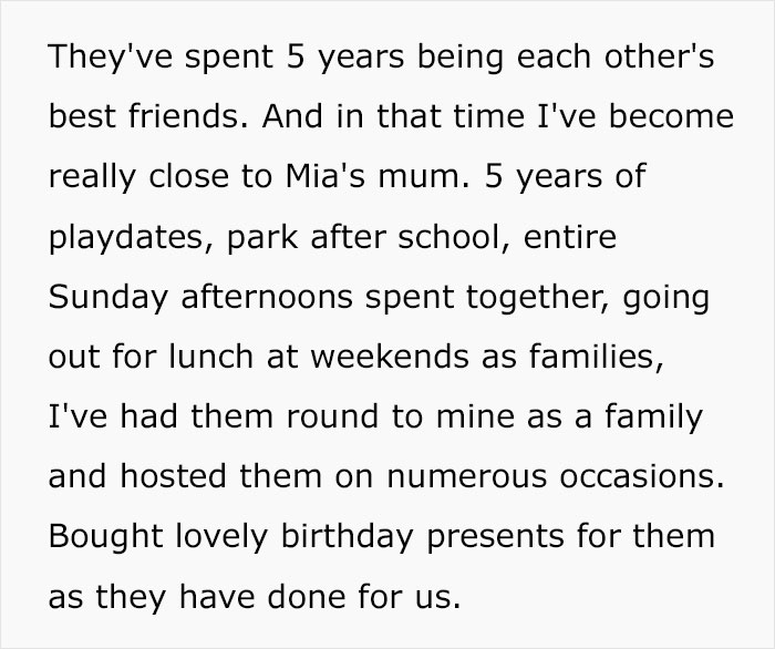 So, the Original Poster (OP) says that this girl (let’s call her “Mia”) had been her son’s best friend since pre-school times. They willingly played together, attended each other’s birthdays, and were generally inseparable. Accordingly, the kids’ mothers also made friends, and our heroine became really close to Mia’s mom.