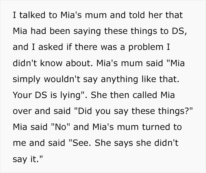 However, when Mia and her mother met with the author, the girl flatly denied the very fact of any insults towards her friend, claiming that he was just lying. Accordingly, Mia’s mom was also hostile towards the OP. Well, after some time, at school, Mia subjected the poor boy to even more bullying ‘for snitching on her.’