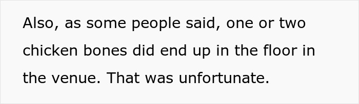 Load More Replies..."One or two chicken bones did end up in the floor in the venue." Translation: "We made such a huge mess, it would easily put pigs to shame & make a dumpster weep with jealousy, but we didn't really care as long as Johnny could stuff his maw with cheeseburgers & fried chicken -- our boy has such limited palate!" 🤦♀️