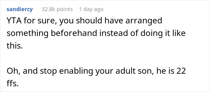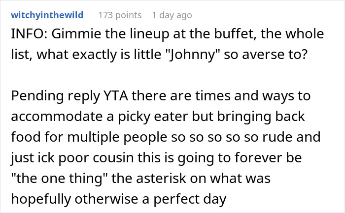 Some commenters also believe that the reception food was most likely expensive and given to her and her son for free. And instead, the guy left for other food, which is already incredibly impolite of him. Moreover, bringing that smelly food back to the reception would be seen as tacky and insulting. If the OP’s son was, say, four years old – okay, let him bring his chicken nuggets to a wedding. However, 22 years old and still wiping an adult child’s backside and treating him like a toddler looks extremely weird, people in the comments claim.