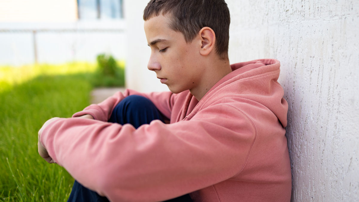 Teen sitting alone outside, looking upset and overwhelmed being a third parent to seven kids at his mom’s house.