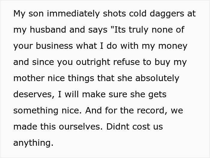 The OP was delighted, which cannot be said about her hubby. Jeremy stated that such a thing was probably worth a lot of money, and that Chris should have saved the money, and not scattered it right and left. To this, the OP’s son replied rather sharply that, firstly, Jeremy does not care what he spends his money on, and secondly, he made this gift with his friends with their own hands, without spending a cent.