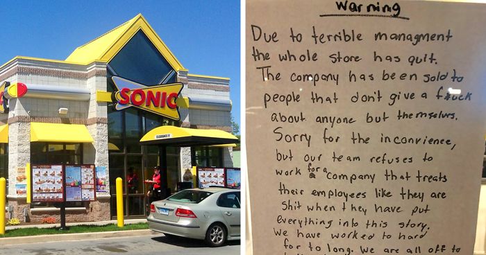 Last week the customers who stopped by Circleville’s Sonic burger place were greeted with a warning put up on the door. Apparently, the place was left empty, with doors locked and lights on as all of the staff have walked out. The only thing they left behind was a handwritten note addressed to the customers which stated that due to terrible treatment from the new management, the whole staff has quit.