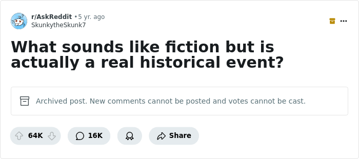 Redditors have been sharing stories from the past that sound fictional yet are somehow true, so we’ve gathered the juiciest ones below. From amazing victories to devastating tragedies, all of these tales sound like they came straight out of a creative novelist's mind. So enjoy making your way through the history lesson below, and be sure to upvote the stories that you wish you had been taught in school!