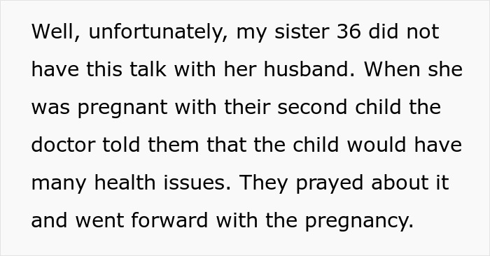 His sister didn’t have this talk with her husband, so when the doctors said that her second child would have a lot of health issues, they went forward with the pregnancy