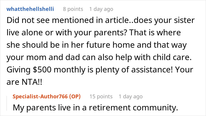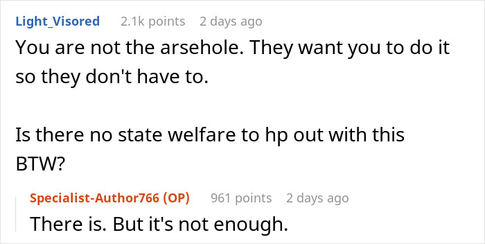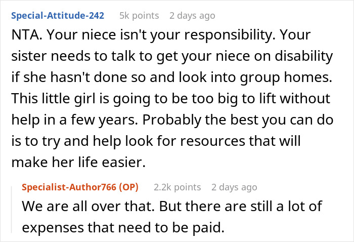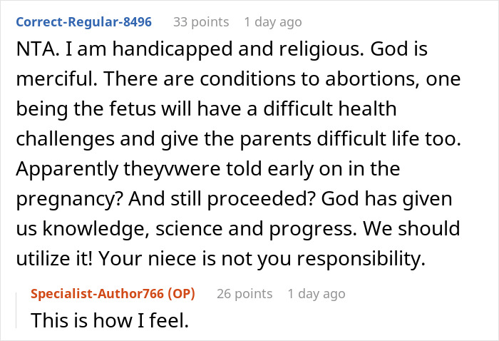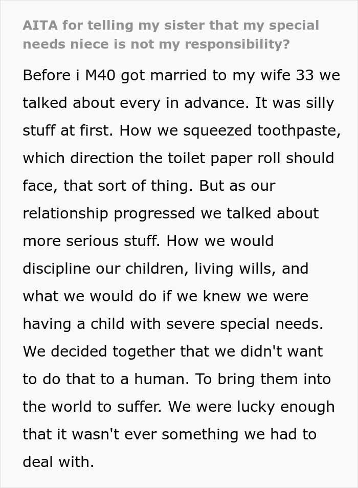 Load More Replies...Healthy child or not, the parents' decisions to go through with the pregnancy is their own and the bringing up said child is also their own. If one of the posts is true, the sister hasn't checked all the money she can get from the government. NTA. It's the sister's and her ex's responsibility of taking care of that child. OP's wife works from home, so wouldn't have time even if she wanted to. And their children would feel left out because everyone's attention would be on the niece and that's not an option.