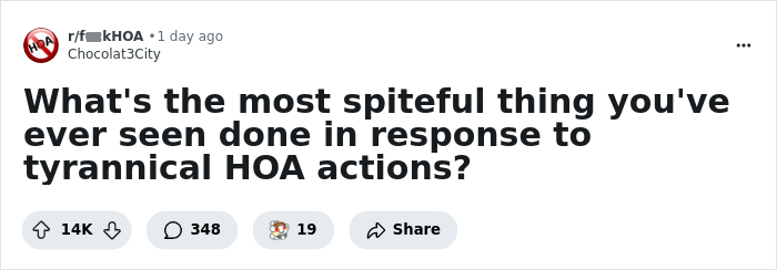 Load More Replies...these are reasons i refuse to live in an HOA . I am not going to pay 100's of 1000's of dollars for some one to tell me how to live . In our town the planning commission is trying to pass an ordinance that you cant hae recreational vehicle e or trailers in view of the street. and fences cant be over 8ft high. my husband has a racing ]Porche the trailer does not fit in my garage so it sits in the driveway there is no garbage around it its very clean not an eye sore . This is the case with alot of people . even during the early stages of Covid alor of healthcare workers in our town used their RV;s to live in and quarrentine. we got sweet justice when several residents parked their boats in the cul- desac where one of the members of the planning commission lived .