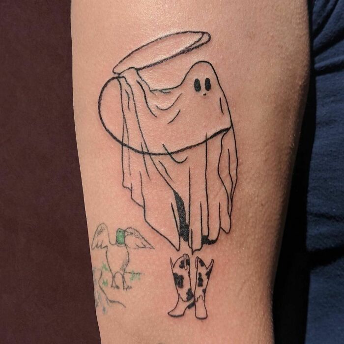 Person with a spooky Halloween tattoo featuring a grinning black ink ghost.