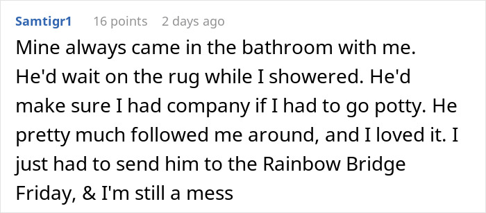 Load More Replies...That comment "mine always came to the bathroom and he'd lay on the rug.." I legit initially thought she was speaking about her SO doing something the same as OPs SO 😄