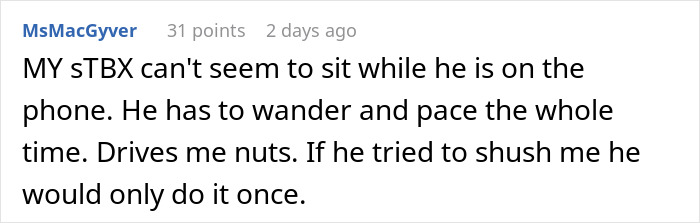 Load More Replies...The thing about unconsciously following a person around the house while on the phone is totally normal, I think. It's that social animal instinct. The not being able to admit you're doing it when it's pointed out is no bueno. At least the spouse finally got the picture...
