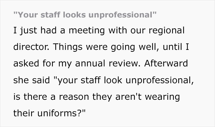 But just because businesses are allowed to do something doesn't make it automatically right. Don't you think it's rather funny that a multi-million-or-even-billion-dollar organization won't even dress their recruits to show up? Redditor u/pacify-the-dead does. Recently, they made a post on the subreddit r/AntiWork about a meeting with their company's regional director. She told u/pacify-the-dead that their staff looks unprofessional and that everyone on the team better buy the uniform.
