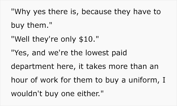 The fact multimillion dollar corporations can't find $150 to buy uniforms for every employee is crazy to me.