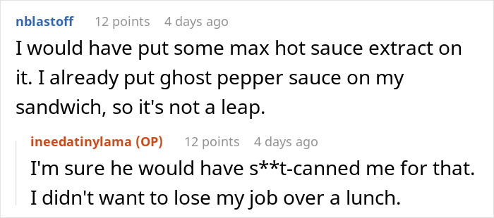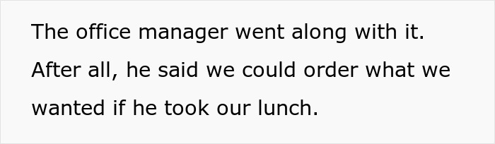 “Truth is, I would’ve shared my lunch with my coworker if he had asked. In fact, at least in my country, it’s a common courtesy to share food by asking others if they’d like some. In my opinion, there’s no shame in asking others if they’re willing to share a bit of their food and most people would probably say yes. That said, it’s beyond rude to just take food that doesn’t belong to you,” the redditor told us during a previous interview.