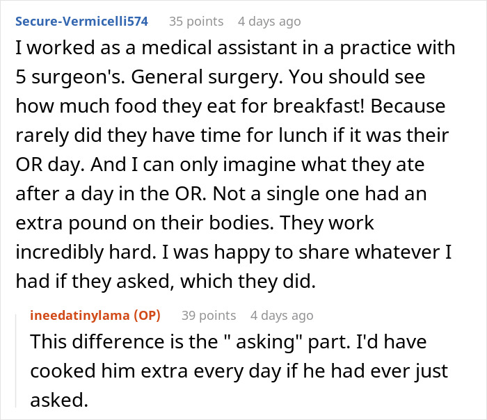 The OP explained how the orthopedic surgeon she used to work for would take his team’s leftovers from the fridge because he wouldn’t get lunches off. He’d be too busy to go out and buy something for himself. He’d simply help himself to whatever was available.