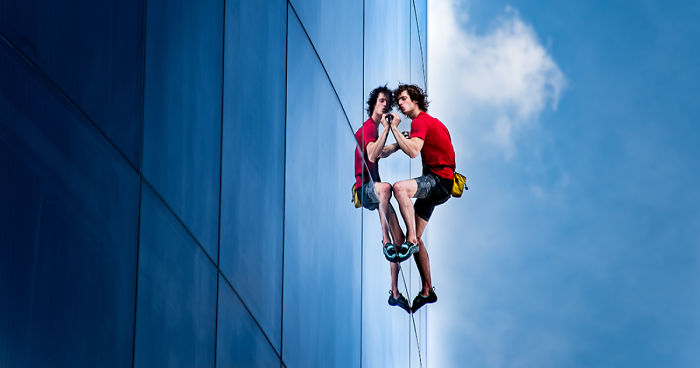 Adam is known for being able to climb the heaviest climbing paths of the world, so I put him in an art photograph as he climbs a glass building. In this case, Adam was protected by the rope which we removed it in the final photograph.