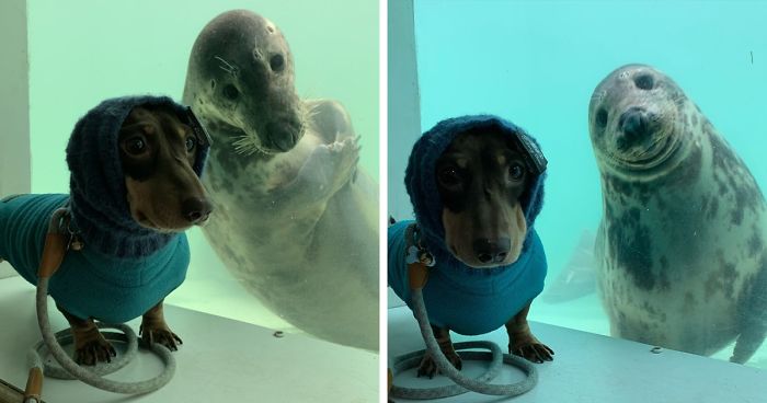 Talbot, the dachshund’s owner, explained that it felt like they were friends at first sight. The way they were booping their noses at the glass made it look like they’re whispering to each other. They then struck some poses for the camera with Aayla looking more like a dog with her tilted head than an actual seal.
