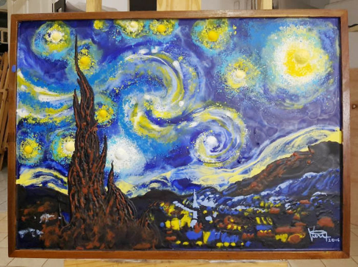 ‘Starry Night’ is one of my favorite paintings so that I was compelled to paint, I see the wax medium characters fit perfectly with the Van Gogh painting.