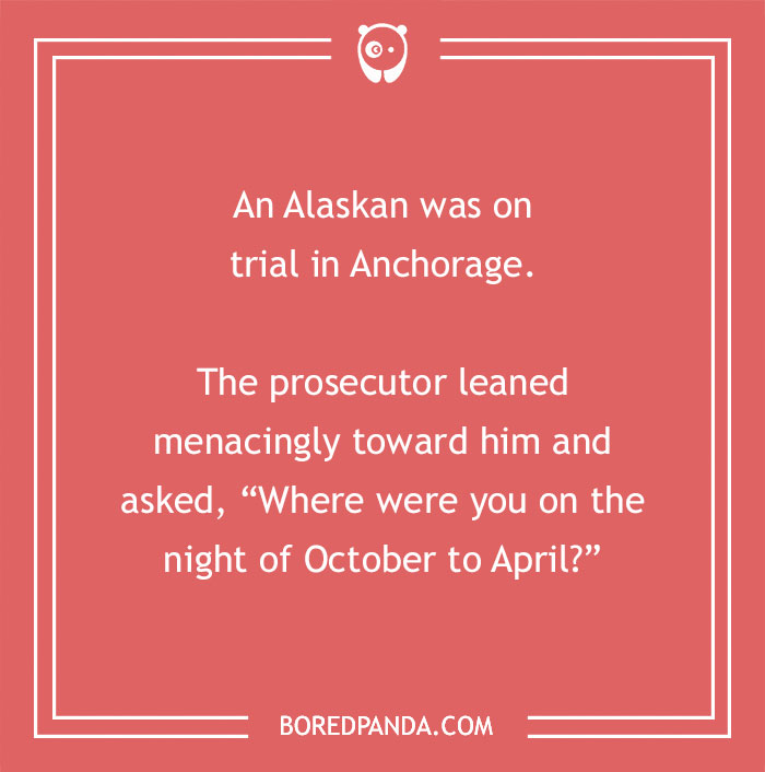 A drunk Alaskan decides to go ice fishing. He starts sawing a hole in the ice, but just then a booming voice says, “You will find no fish there.” The drunk ignores it and continues sawing. The voice repeats, “You will find no fish under the ice.” The drunk looks up and says, “God, is that you?” The voice says, “No, I’m the manager of this ice rink.”