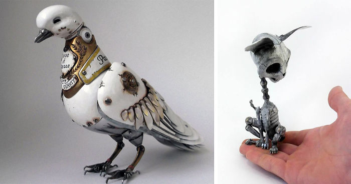 A lot of work goes on behind the scenes before Verniy creates his steampunk artwork. He observes his creations’ living counterparts to ensure that he captures their movements just right. Then, he assembles them from various pieces of scrap metal and recycled materials – old car parts, bike parts, clock movements, tableware, and anything else that fits.
