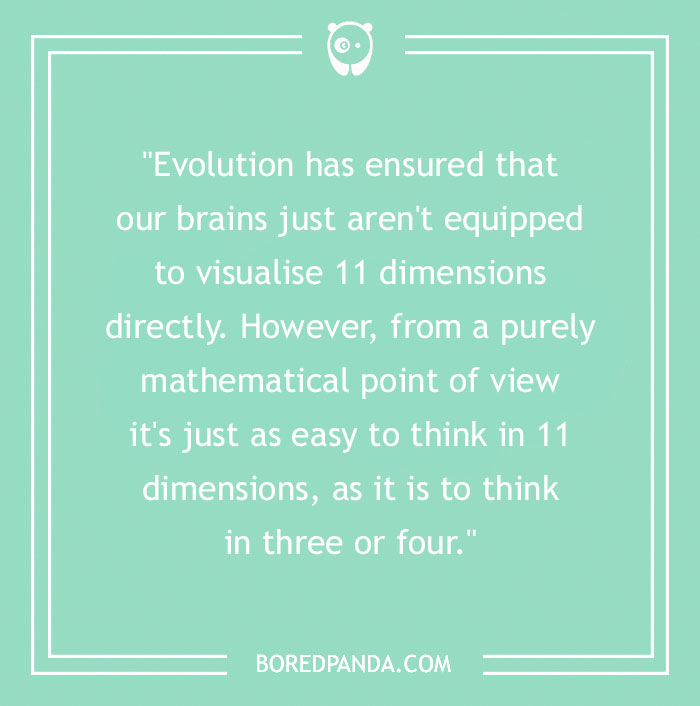 "Evolution has ensured that our brains just aren't equipped to visualise 11 dimensions directly. However, from a purely mathematical point of view it's just as easy to think in 11 dimensions, as it is to think in three or four."