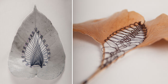 She starts by coating each leaf in a non-toxic preservative that stiffens them up and protects them. Then, she cuts them into various forms and embroiders them or simply puts various embroidery stitches them onto their uncut surfaces. “I generally try to use renewable, sustainable, and environmentally friendly materials for my unique art, so this was an obvious choice,” explains the artist.