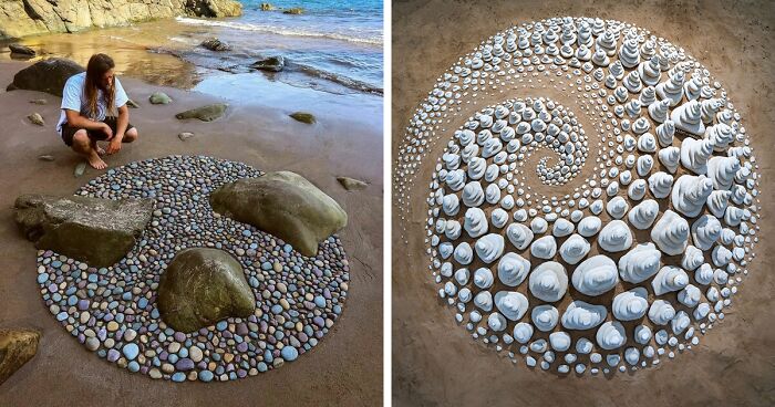 The land artist from Pembrokeshire, Wales started experimenting with pebbles and stones, by gathering similar shapes and colors to create beautiful patterned art. Jon also plays with other materials such as leaves, sticks, shells, sand, and even moss: everything that could be found in nature. Thanks to his artistic expression, Jon now has 606K Instagram followers and thousands of likes on his posts.