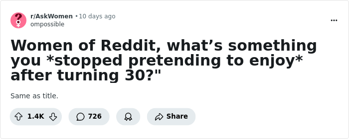 Members of the ‘Ask Women’ community have recently shared what things they starting noping out of after reaching 30. One user asked them what they stopped pretending to like, and the women compiled quite an extensive list, which you can browse by scrolling down just a little bit.
