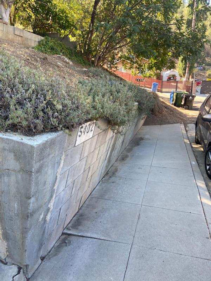 This failing retaining wall won't last much longer. Some movement over the years has taken place and has caused the wall to lean into the sidewalk.