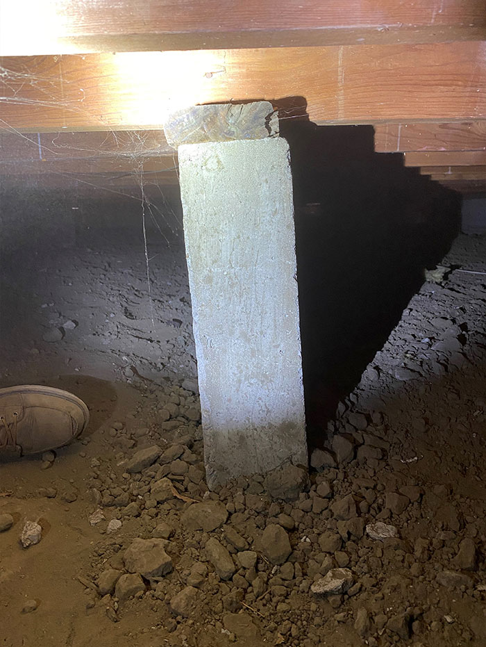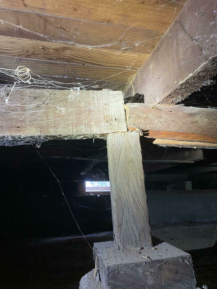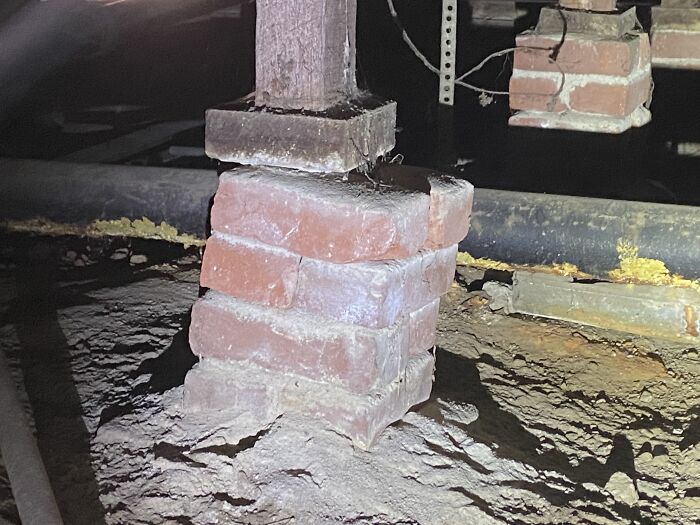 Friend's house was built 20 yeasr ago. He noticed a sag. Contractor crawls in under. The former owner decided to use a jack from a car (as in, the one used when changing a tire) to replace a pier. Yeah, that's working as well as expected.