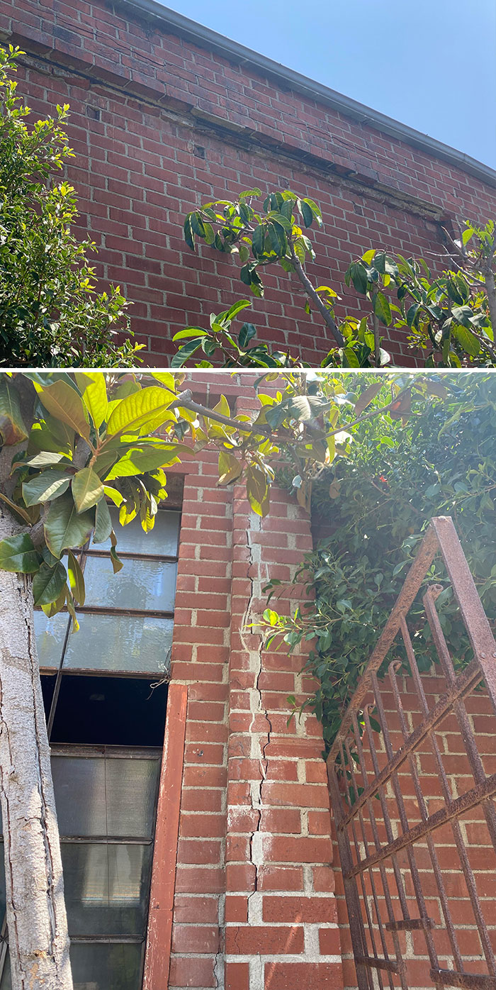 This is a concrete and brick structure with visible spall damage on the exterior.