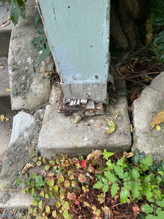 Was it opposite day when this was installed? This is a long concrete pier with a wooden shim acting as its post... Pretty strange.