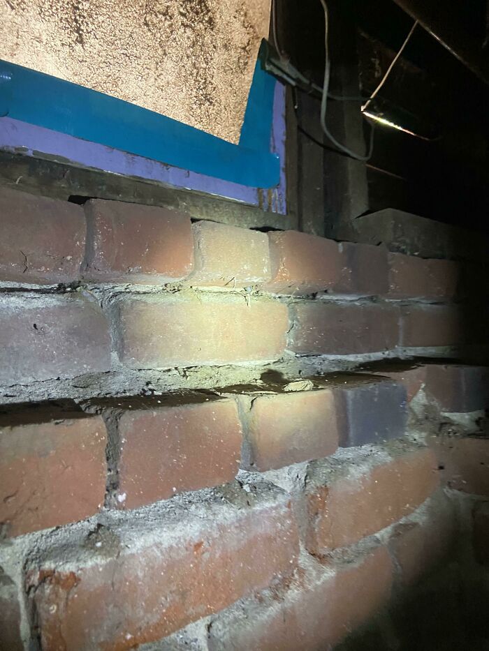 Here's a brick foundation where the mortar has degraded almost entirely. Only a small section (in the middle of the brick wall) has solid mortar. Replacing or sistering this foundation would be the only solution for this homeowner.