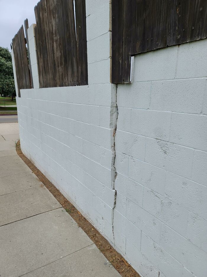 The external foundation walls of this building are bowing, and many of the bricks are falling out of place. (Image 2)