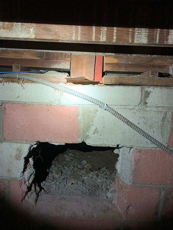 Here is a brick pier that's sitting dangerously close to a big hole in the ground. Something tells me the homeowner will start to feel some dipping in the floors soon!