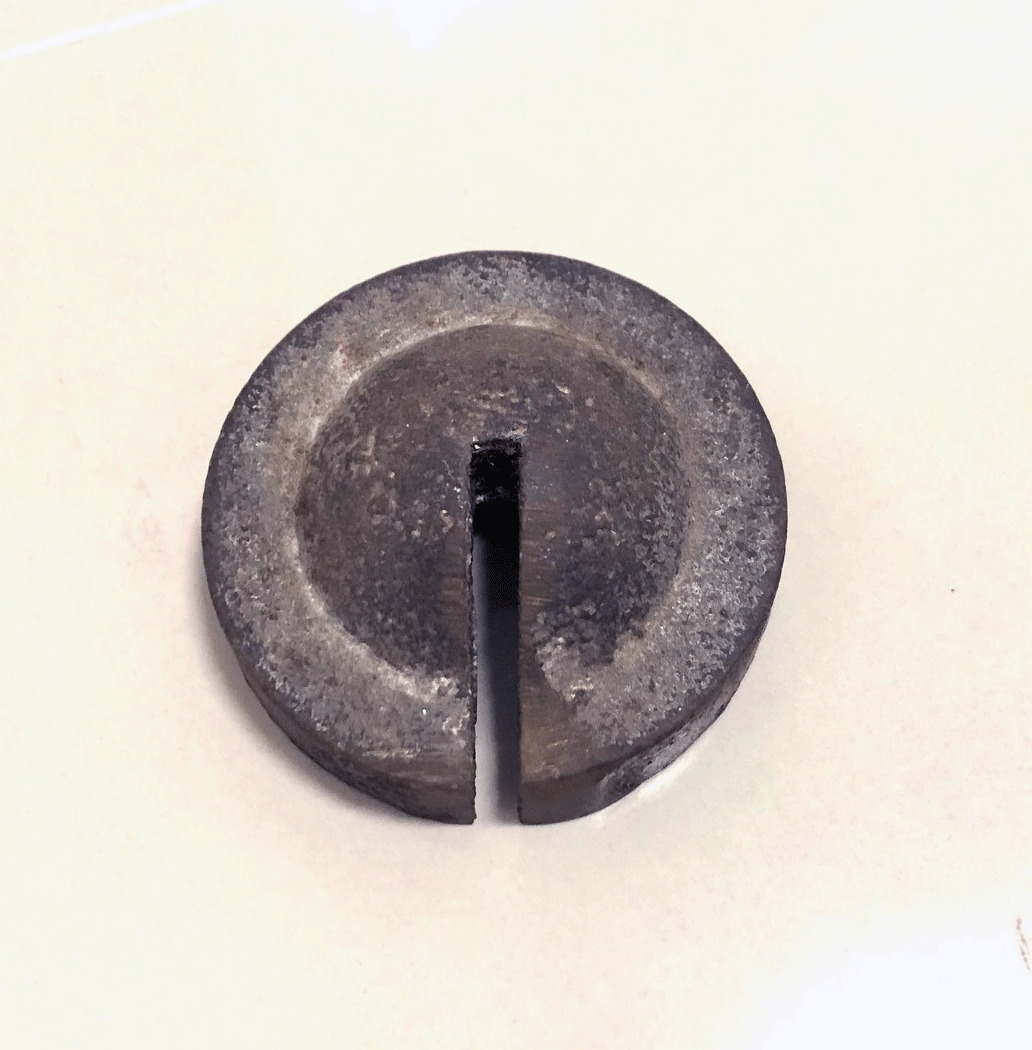 Found In A Garage In The Pnw. Metal, Copper-Colored Disk About 2-3 Inches Across And Over 1 Inch Thick. One Side Has 2 Teardrop Grooves That Almost Looks Like A Pig Nose, The Other Side A Holographic Sticker Of A Rock And Roll Skeleton Skull