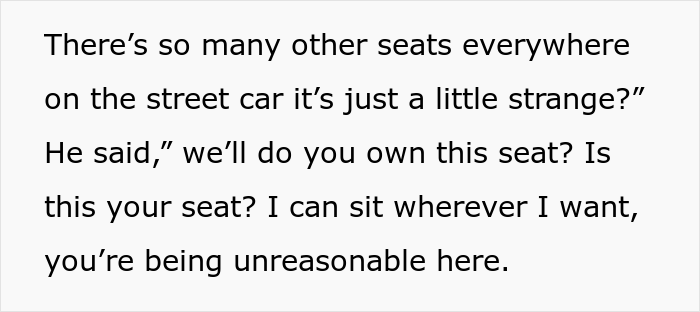 Load More Replies...Has common courtesy become such a foreign concept to people that they now just act like complete jerks? There is absolutely no reason to sit next to someone on an empty bus, train, cablecar, or whatever. This person was trying to be a creep and when you called him out on it he got mad.