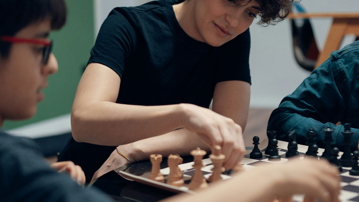A focused young person moves a chess piece, displaying keen intelligence during a game with two companions. I enjoy playing chess, and I'd say I'm probably better than the average person on the street. I once played a guy who absolutely destroyed me in about five minutes, and the only reason it took him that long was because he was also playing five other people at the same time (six different boards) and he beat all of us. One guy was particularly good so it took probably twenty minutes to beat him. My game was over in about 15 moves. He was playing so fast at the beginning that he didn't even really stop moving his feet...he just kind of kept walking slowly from board to board constantly.