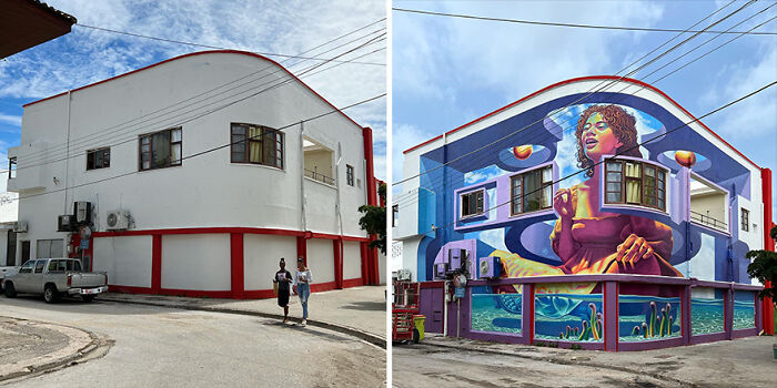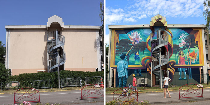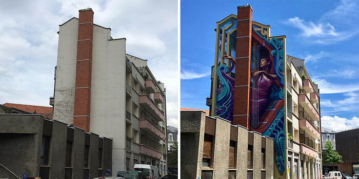 I've seen stuff like this before, but the way this artist truly works with the space, shape, windows, fences, etc instead of just around them is really next level. The whole building becomes so well integrated into the piece itself. Marvelous perspective and skill.