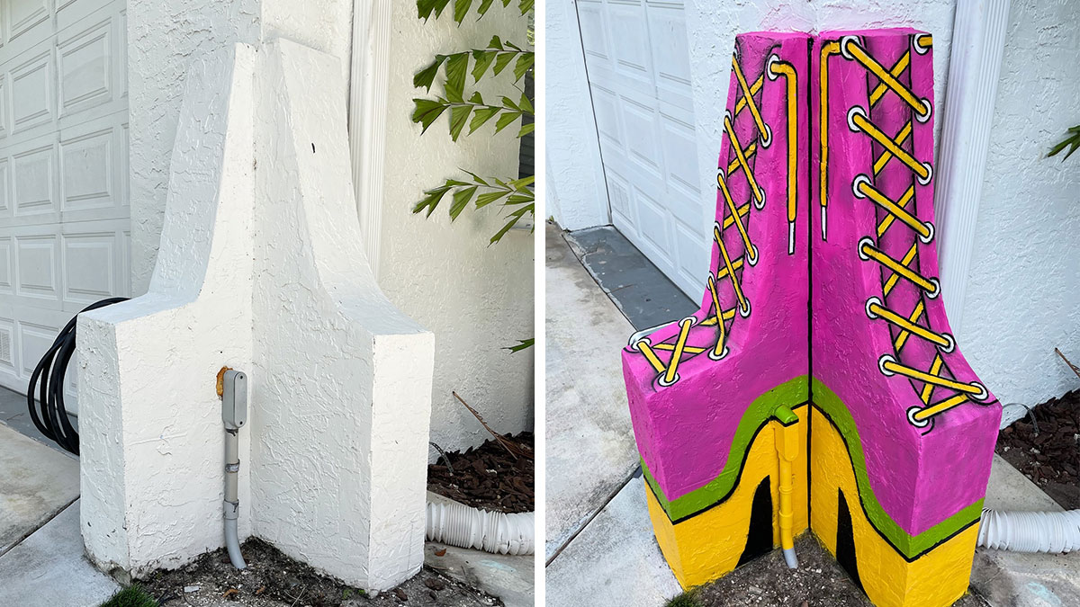 Before and after images of urban whimsy by Tom Bob, showing a plain wall corner transformed into a colorful boot mural.