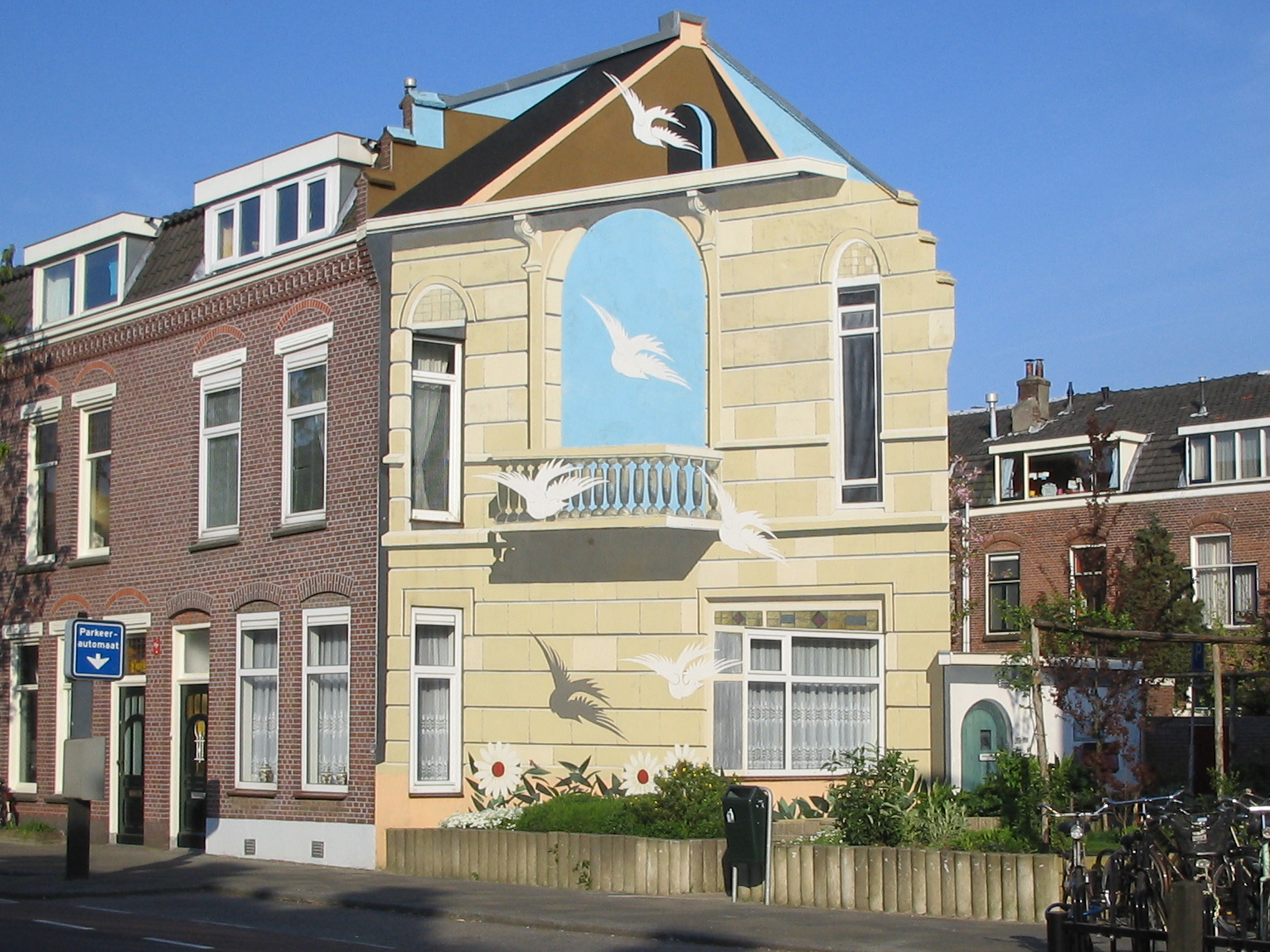 Proud of my hometown Utrecht. We have more mural paintings. One that I’m particularly fond of is in Vogelenbuurt, Adelaarsstraat. Very well done: from one point of view it fits exactly in the row of houses, you wouldn’t even notice it in a photo. Here’s a photo from a slightly different angle. Muurschild...dba983.jpg