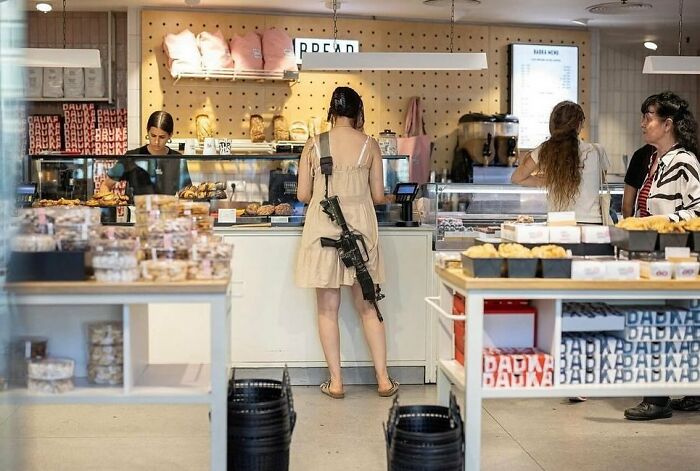 I think this picture was taken in Isreal. I heard that when the country is in active/continuous war, all active service personnels required to carry their gun at all times. However, this would not explain the summer/hot dress instead of army issue.