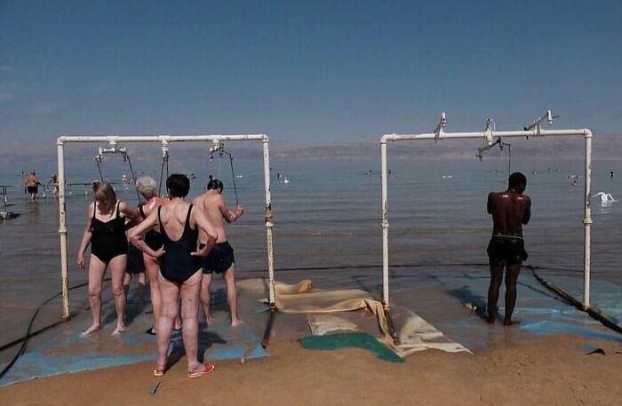 It looks very racist at first glance (and maybe it is), but one little detail to take into account: the showers seem to operate by pulling a string. I see six strings on the left side of the pic, only a single one in the right one. Maybe I misunderstand the contraption, but it looks as if only the one shower actually works. *IF* that is the case then there is one person in the line, waiting (sensibly) for one of six showers to be free, instead of cueing right and "hurrying" the singler user on.