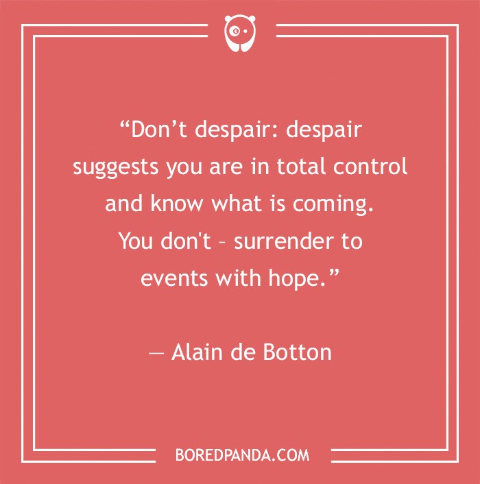 “Don’t despair: despair suggests you are in total control and know what is coming. You don’t – surrender to events with hope.” — Alain de Botton