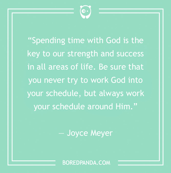 “Spending time with God is the key to our strength and success in all areas of life. Be sure that you never try to work God into your schedule, but always work your schedule around Him.” — Joyce Meyer