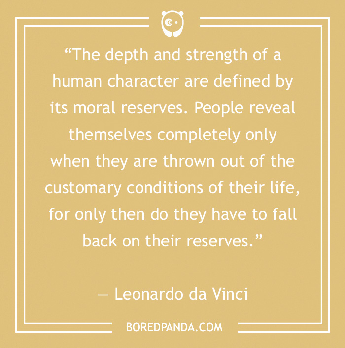 “The depth and strength of a human character are defined by its moral reserves. People reveal themselves completely only when they are thrown out of the customary conditions of their life, for only then do they have to fall back on their reserves.” — Leonardo da Vinci