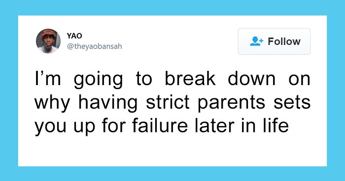 Recently, a Twitter user @theyaobansah shared an illuminating thread on how “having strict parents sets you up for failure later in life.” So he broke down the ways that growing up with strict parents affects your walks of life, like career choices and relationships, and the thread has resonated with many people. Amassing 64.4k likes and 17.3k retweets, it shed light on the scope of damage that overly controlling parents can sometimes cause.