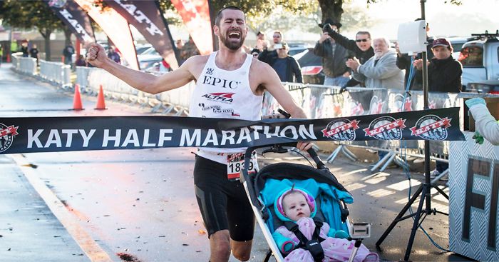Many dads struggle to do any sort of physical activity with their children, but Calum Neff managed to break the world record time for completing a half marathon with a stroller. His 11-month-old daughter, Holland, crossed the Katy, Texas, finish line just a little ahead of her father, who clocked in at 1 hour, 11 minutes, and 27 seconds.