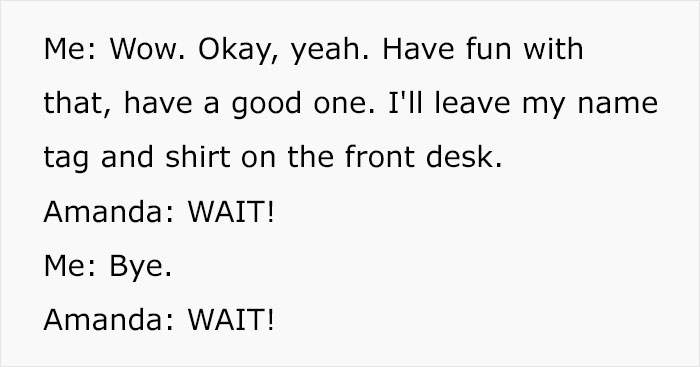 Fired? Great, packing my stuff and leaving immediately, BYE! This is the tactic OP assumed, leaving Amanda stuck in the elevator until the next shift arrived in a couple of hours. They left as a thunderstorm of swearwords was just in full climax, hanging the “We’re Closed” sign on the door and going to Ken, the store owner.